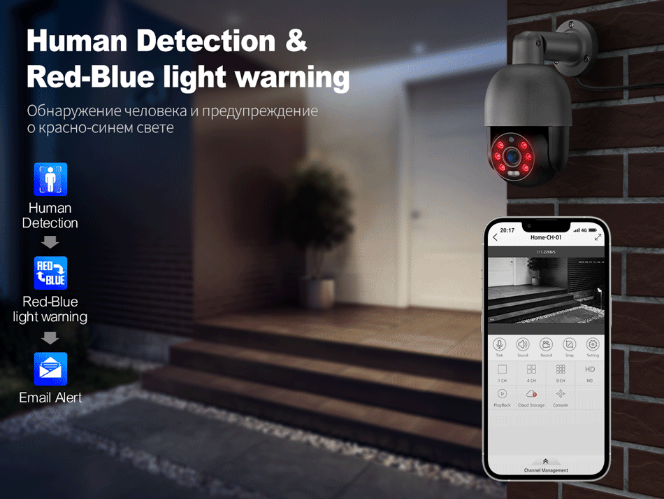 Lorsqu'il détecte un mouvement, les 2 LED blanches et l'alarme rouge-bleu s'allument pour servir d'avertissement et envoient l'alerte par e-mail.